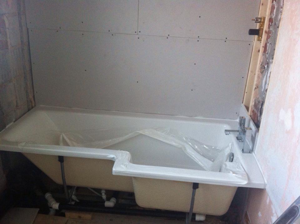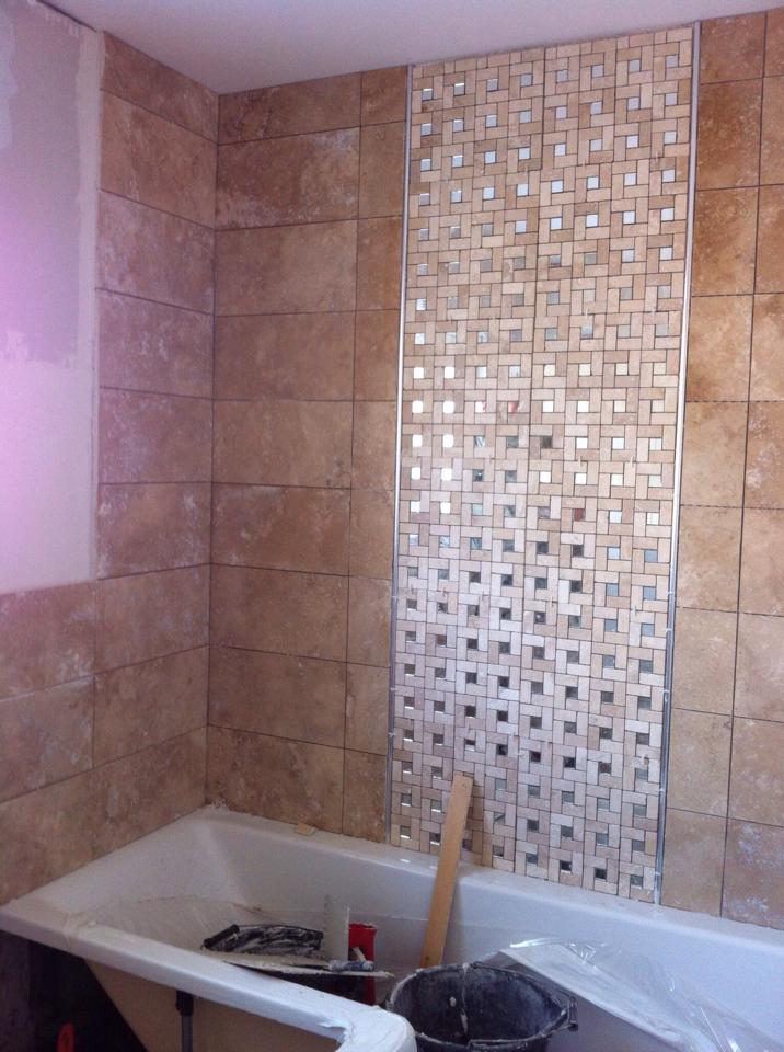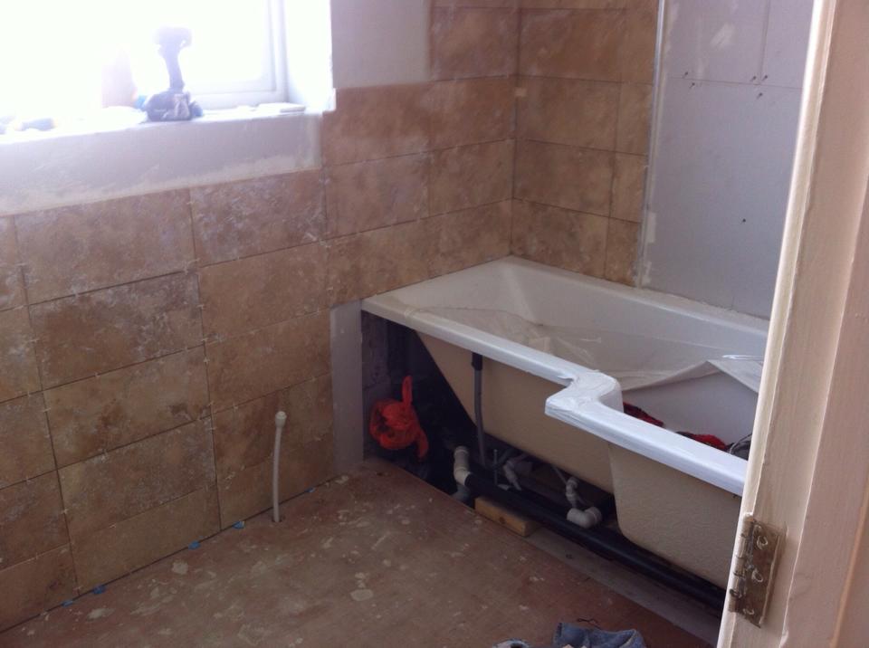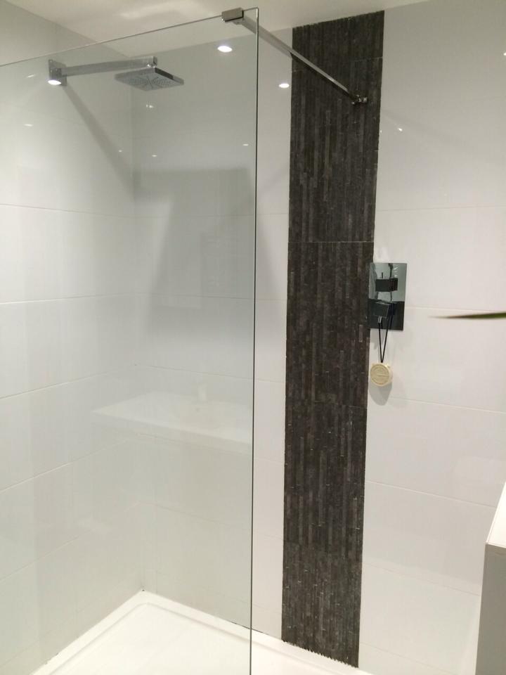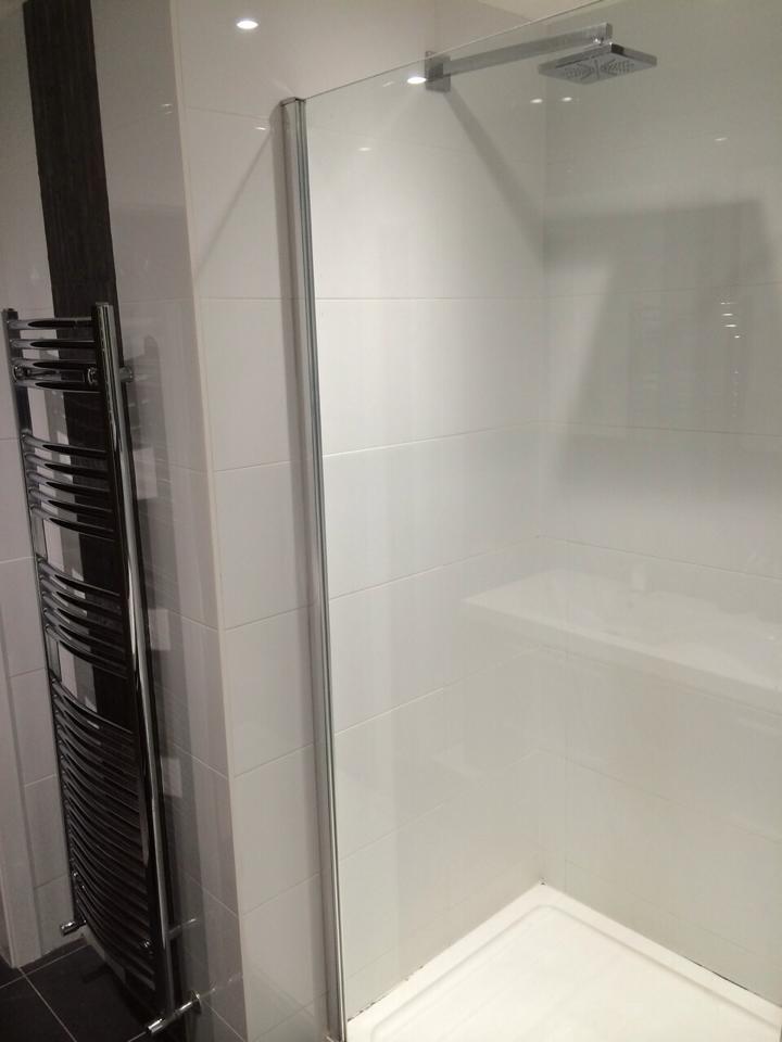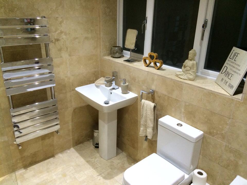 This was a very large dated bathroom with a lot of wasted space so the customer decided to divide it into two rooms. We installed a partition wall to provide an en suite to the master bedroom on one side, and a good sized family bathroom on the other. The room was taken back to brick and re boarded. We supplied and fitted all sanitaryware and finished all walls and floor with tiles chosen by the customer.