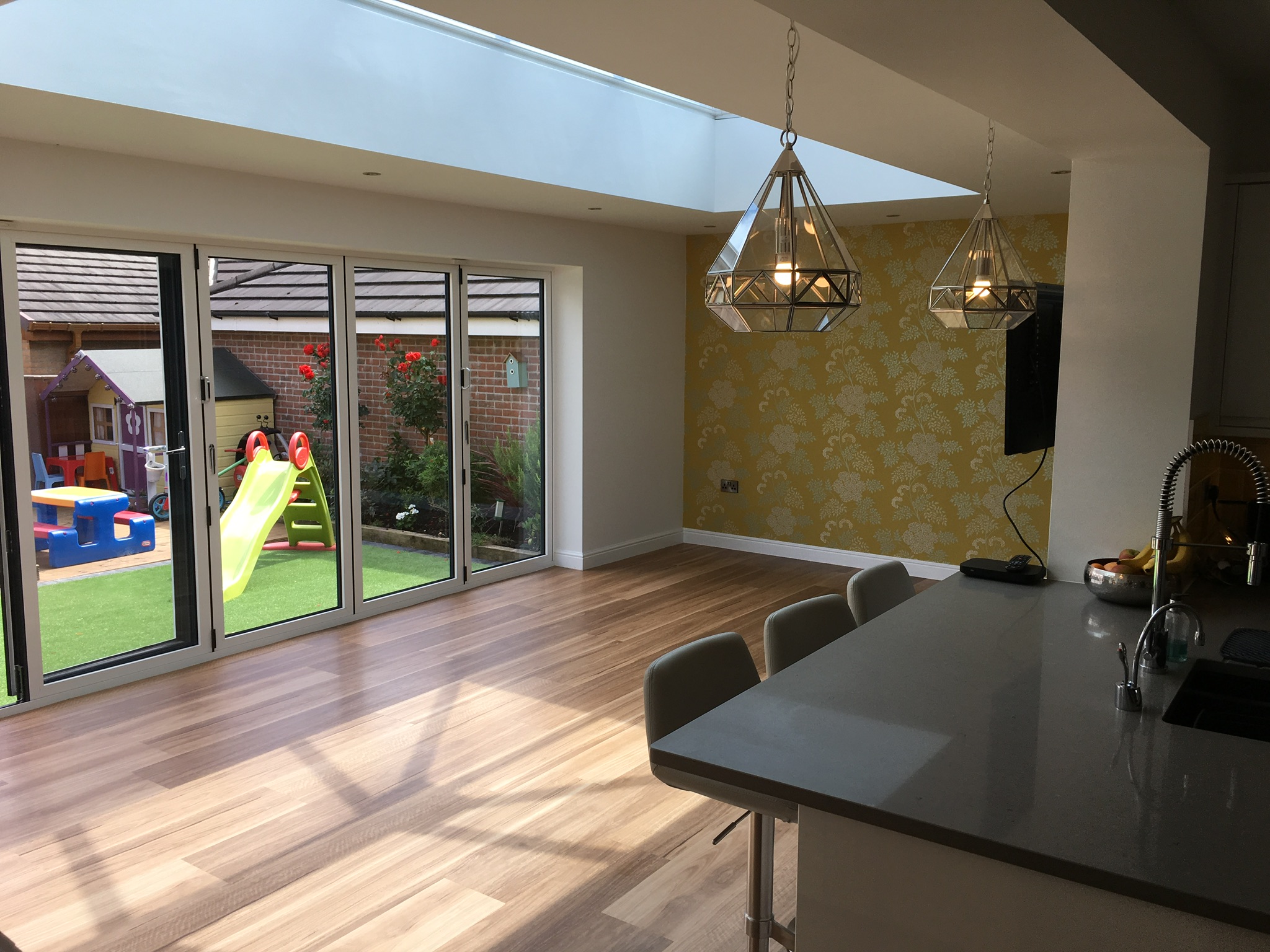 The build consisted of a warm roof with 4.5m x 1.5m lantern and a GRP finish. External walls were finish with a silicone based render to compliment the aluminium bi folding doors, to give it a clean modern look.