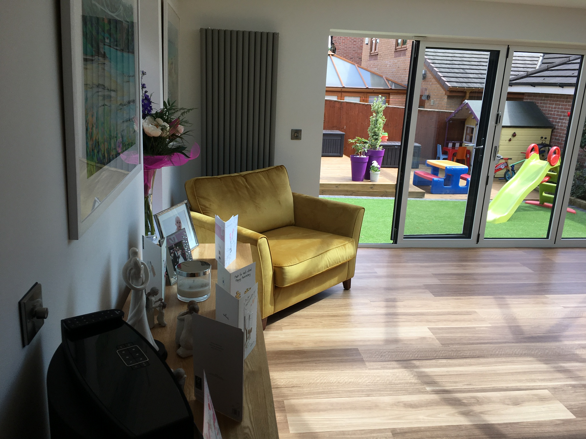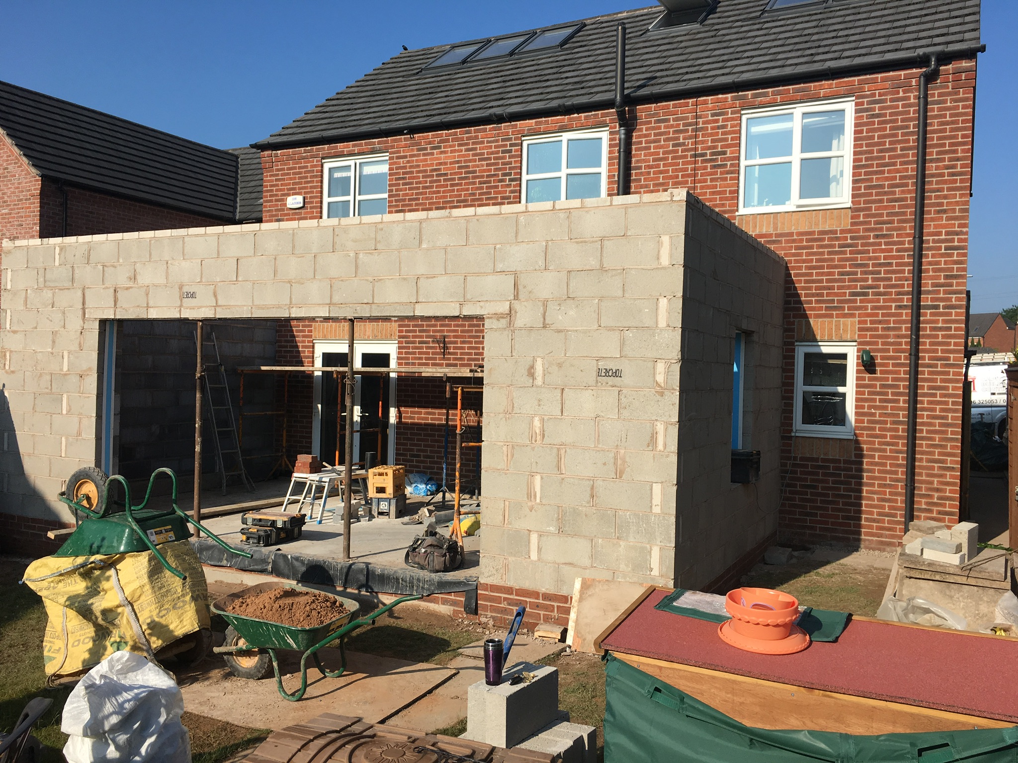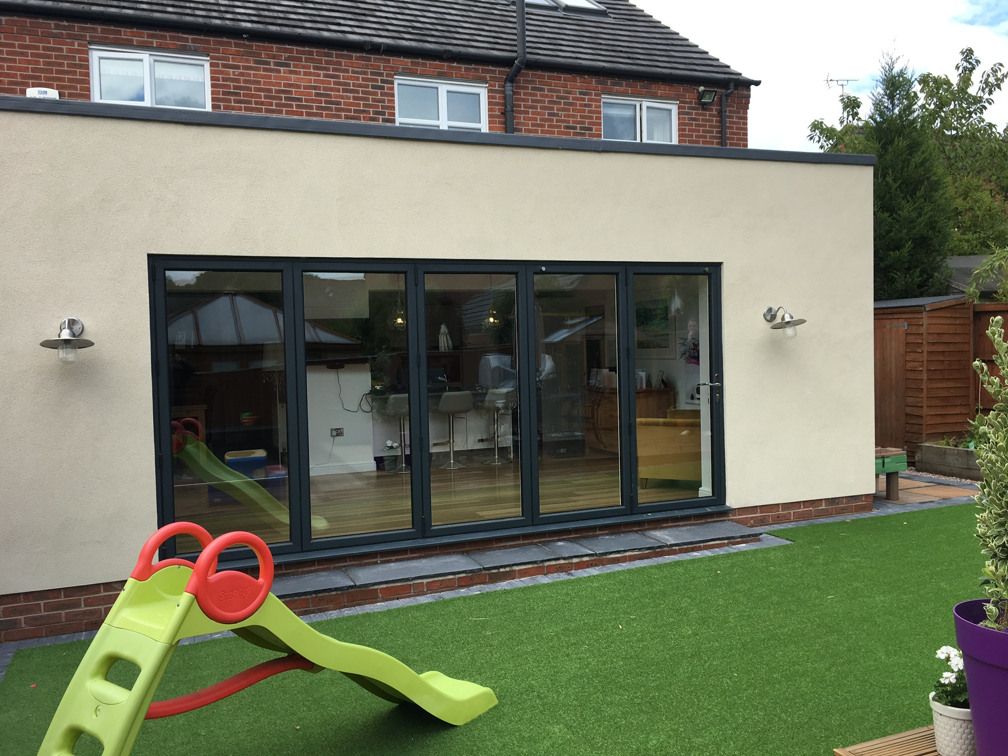 The build consisted of a warm roof with 4.5m x 1.5m lantern and a GRP finish. External walls were finish with a silicone based render to compliment the aluminium bi folding doors, to give it a clean modern look.