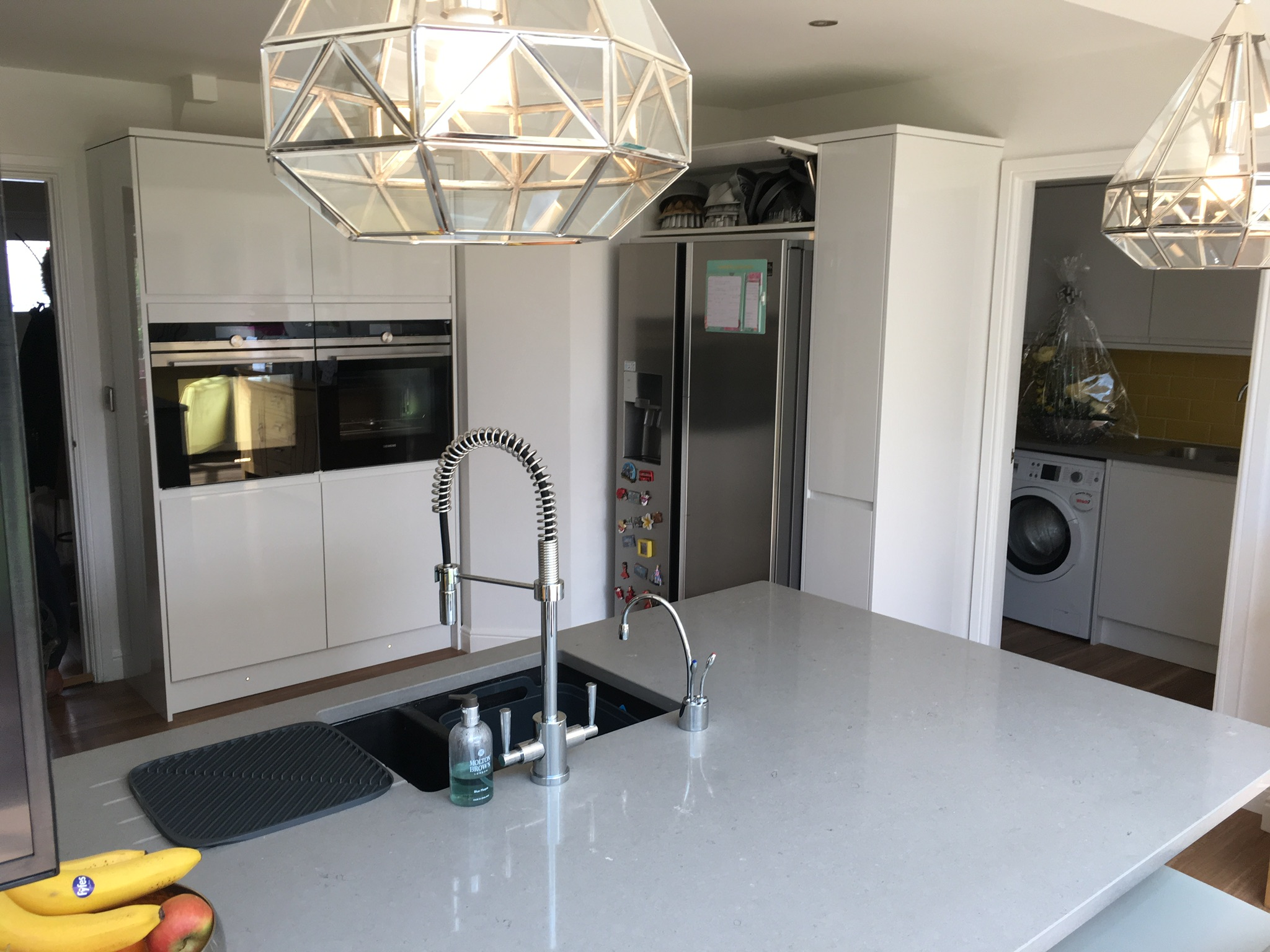 We made the appropriate knock through to open up the kitchen and dining room to our new extension. We removed the old kitchen and utility, re wired both and skimmed throughout prior to the supply and fitting of the new units.