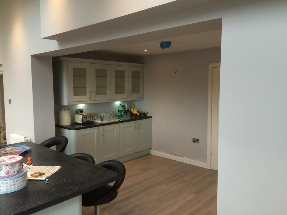 This was a family in Horwich who wanted a large open plan kitchen/diner so they could all spend time together. We firstly built the extension to plans then fitted the kitchen, and flooring throughout. We also installed a new combination boiler and at the customer’s request fitted a new consumer unit to current regulations.