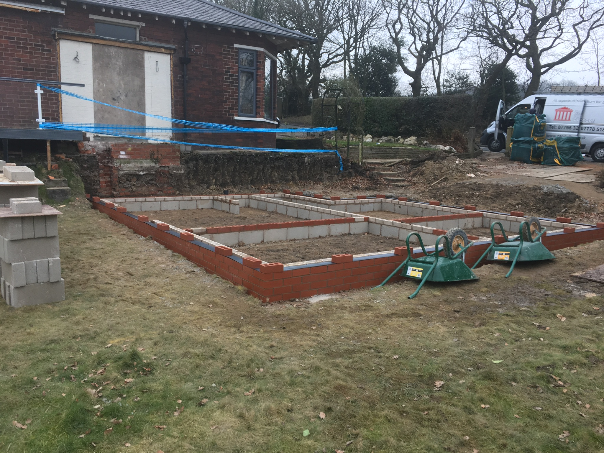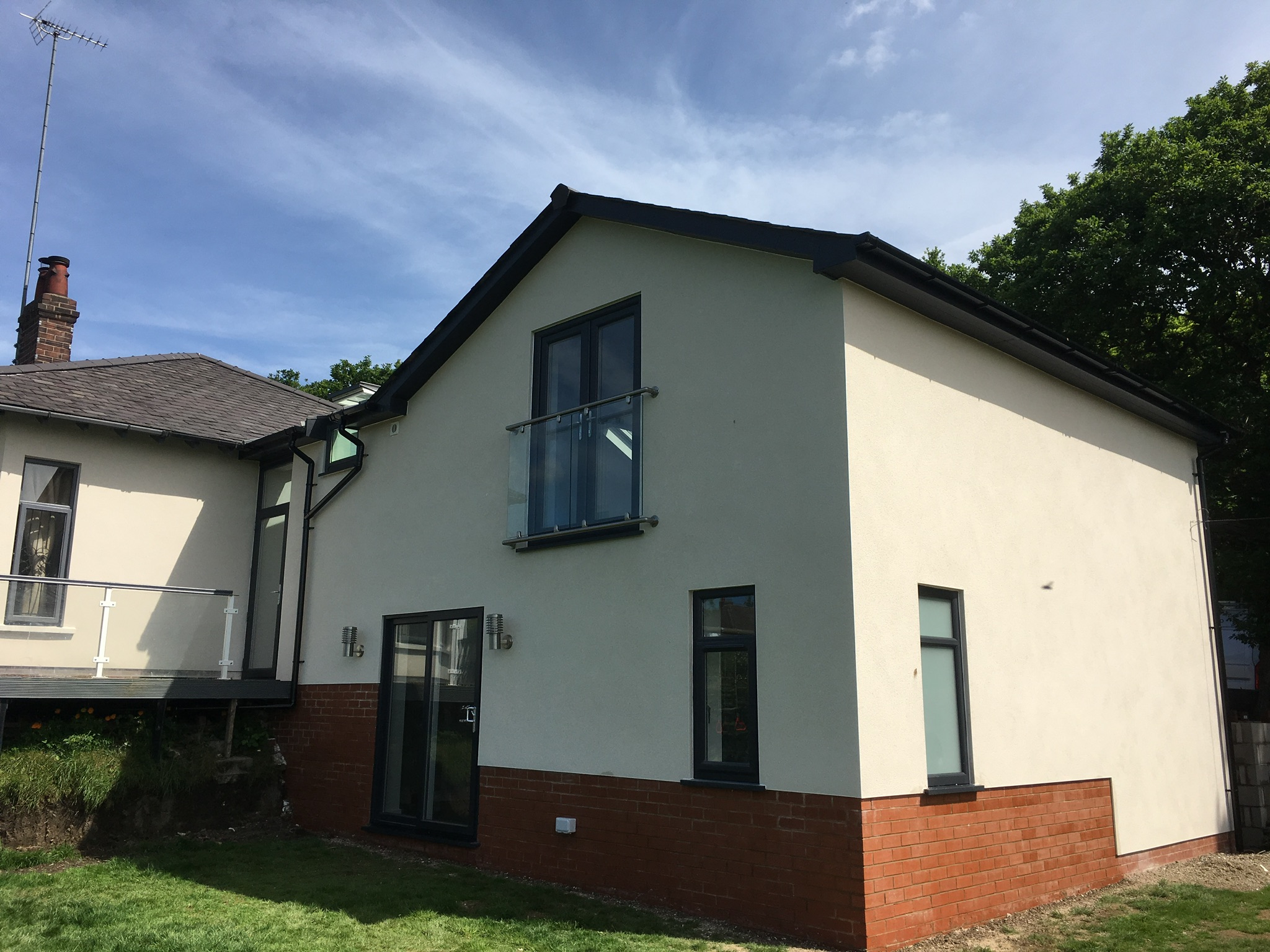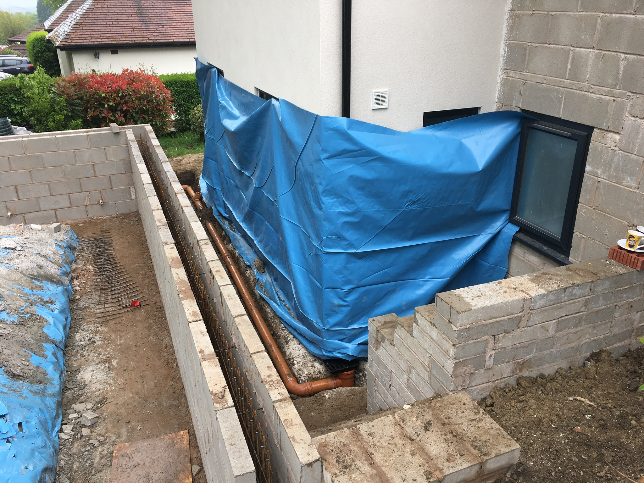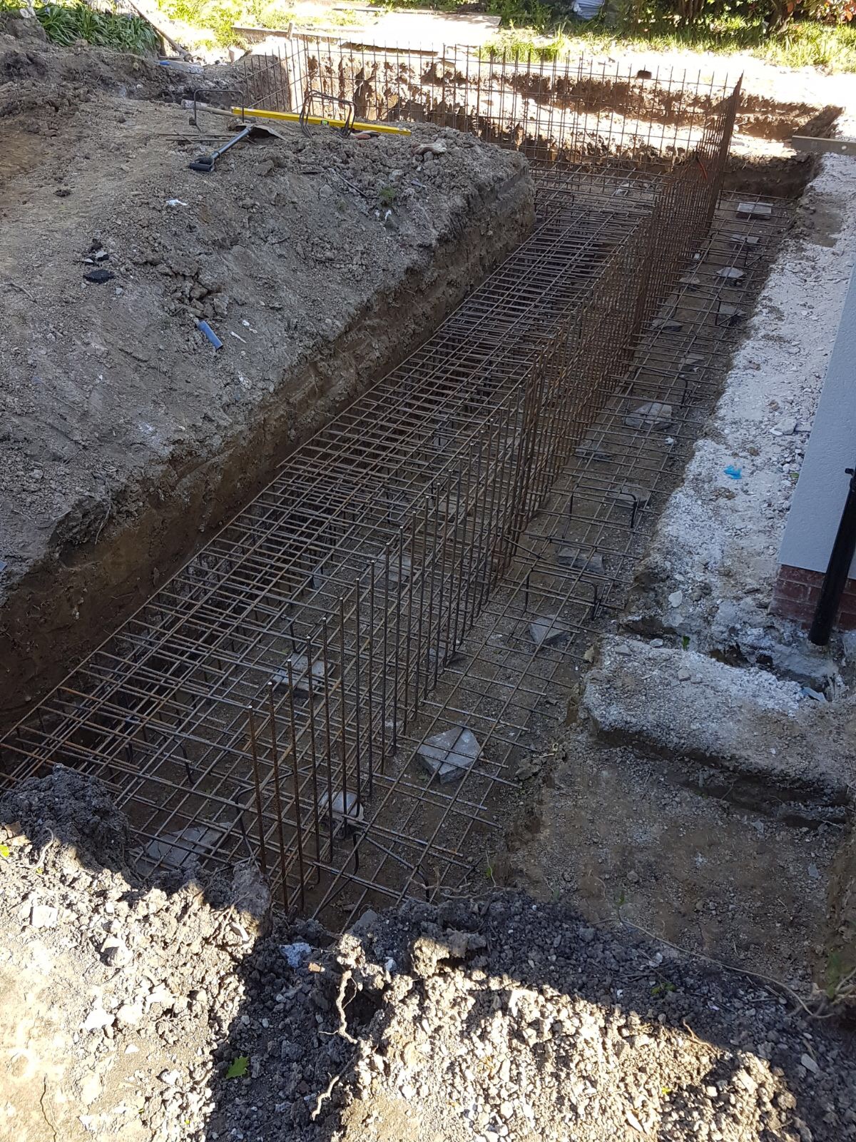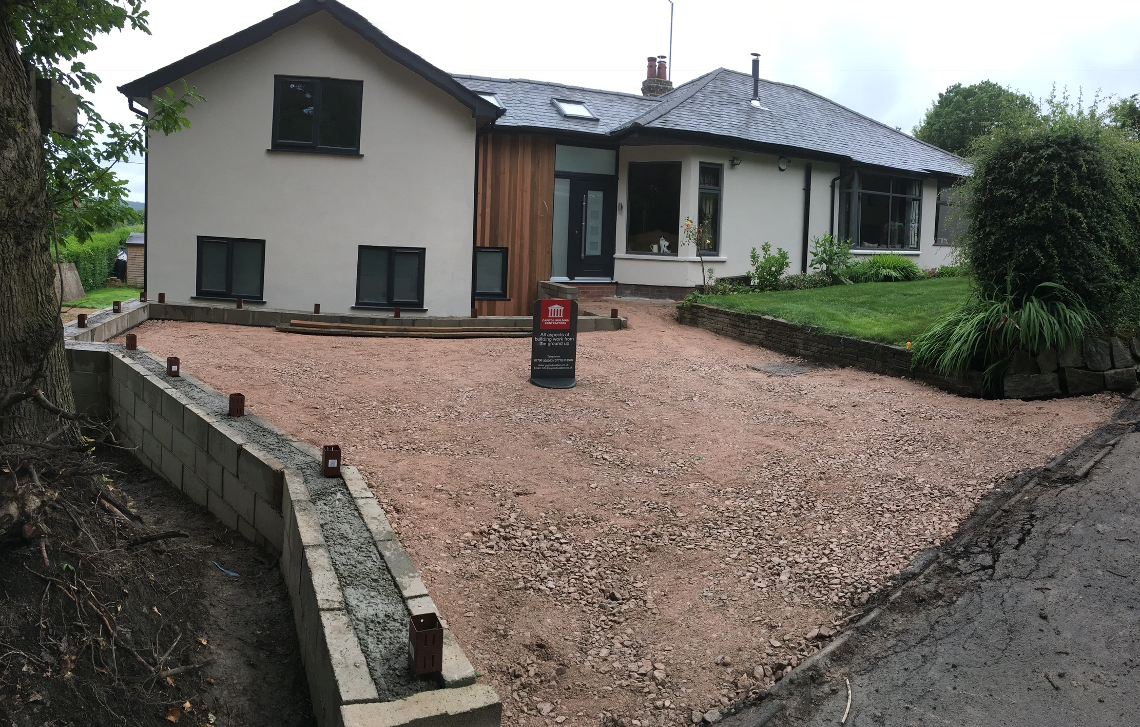 To the front of the property they wanted a raised driveway adding, which needed a retaining wall building. It was built to the engineers design which included an 1800mm wide footing and multiple sheets of steel mesh, The house and extension where rendered and the new entrance was cedar cladded as a visual feature.